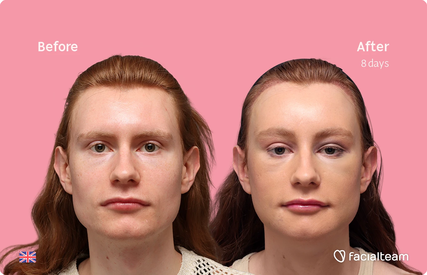 Annah, a 22-year-old woman from the U.K., underwent facial feminization surgery at Facialteam, including forehead feminization with simultaneous hair transplant (SHT), jaw contouring, chin recontouring, and a tracheal shave.