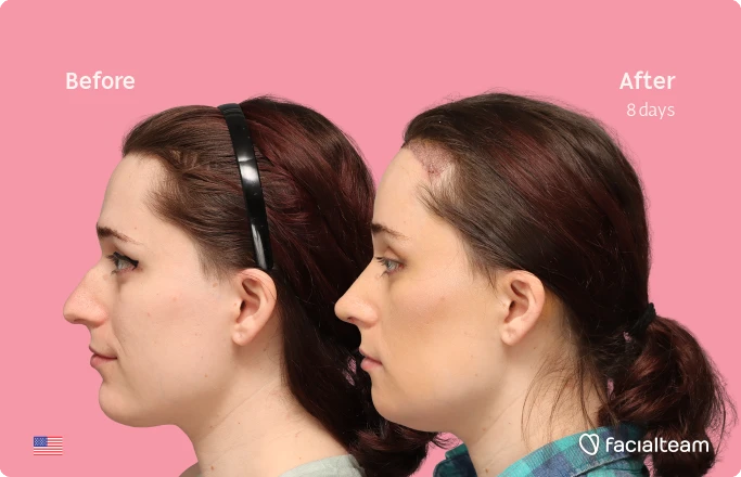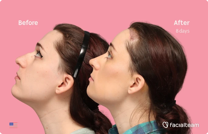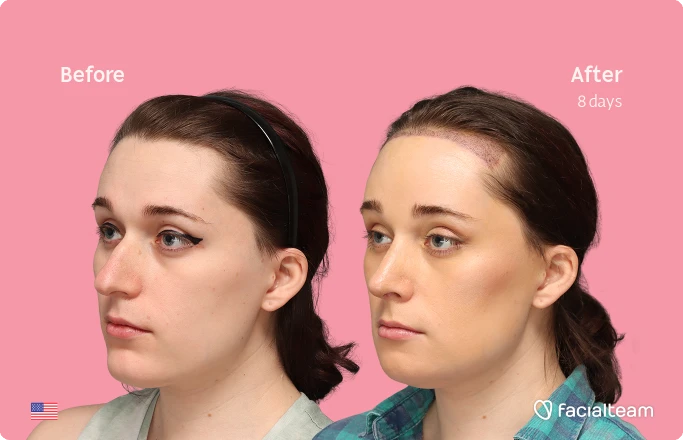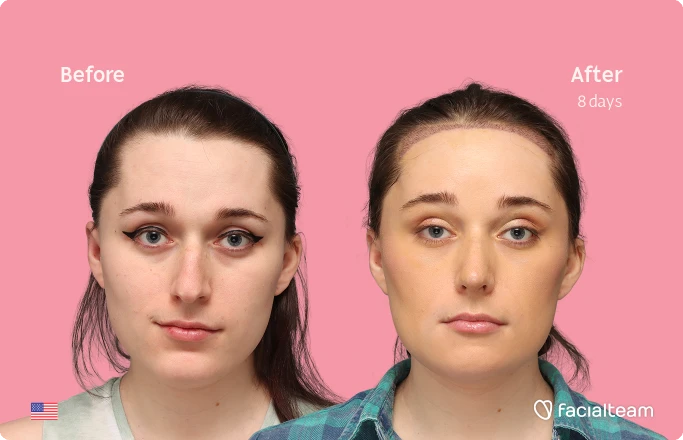 Jessie B., a 27-year-old woman from the United States, underwent facial feminization surgery at Facialteam in Marbella, including forehead feminization with simultaneous hair transplant (SHT), rhinoplasty, and chin recontouring. The before-and-after images, taken just eight days after surgery, reveal the early stage of her transformation. Despite the expected post-operative swelling, Jessie’s facial features already appear softer and more balanced. Her case demonstrates how a combination of procedures can begin to reshape and refine the face, supporting a more feminine and harmonious appearance even in the first days of recovery.