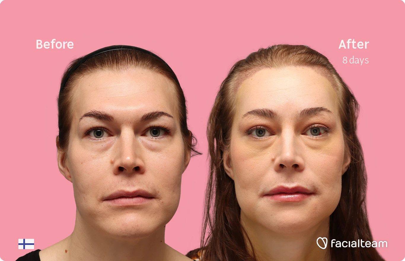 Juuli, a 39-year-old woman from Finland, underwent facial feminization surgery at Facialteam in Marbella, including forehead feminization with simultaneous hair transplant (SHT), jaw contouring, and chin recontouring. As part of her personalized treatment plan, she also received HIFU (High-Intensity Focused Ultrasound) as a secondary procedure to enhance skin firmness and definition. The before-and-after images, taken just eight days after surgery, capture the early phase of her transformation. While some swelling is still present, her facial features already show a softer, more sculpted appearance. Juuli’s case illustrates how a combination of advanced surgical and non-surgical techniques can begin to create meaningful, feminine changes even in the first days of recovery.
