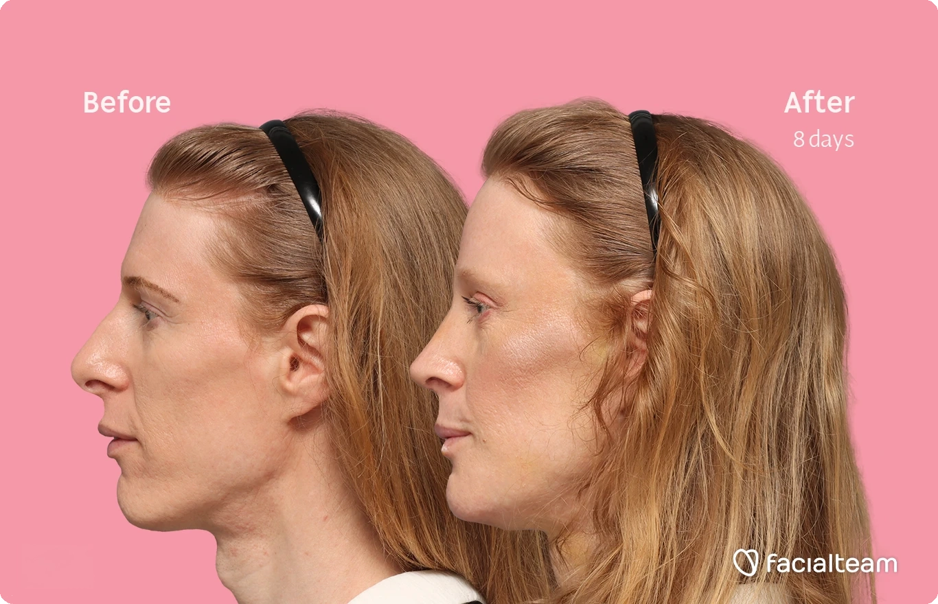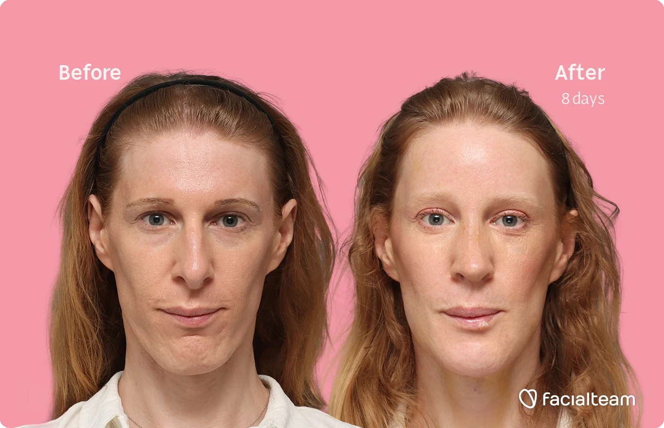 Laura M., a 41-year-old woman, underwent facial feminization surgery at Facialteam in Marbella, including forehead feminization, rhinoplasty, chin recontouring, and a tracheal shave. As part of her personalized treatment plan, she also received HIFU (High-Intensity Focused Ultrasound) as a secondary procedure to enhance skin firmness and definition. The before-and-after images, taken just eight days after surgery, show the early phase of her transformation. Despite some post-operative swelling, Laura’s facial features already appear softer and more refined. Her case highlights how a combination of surgical and non-surgical techniques can begin to create visible, gender-affirming changes even in the initial days of healing.