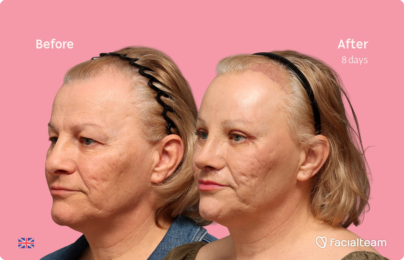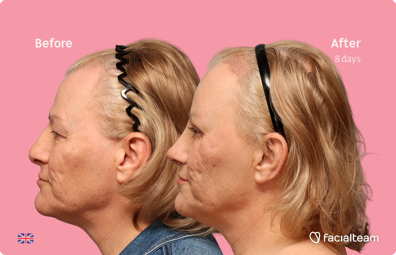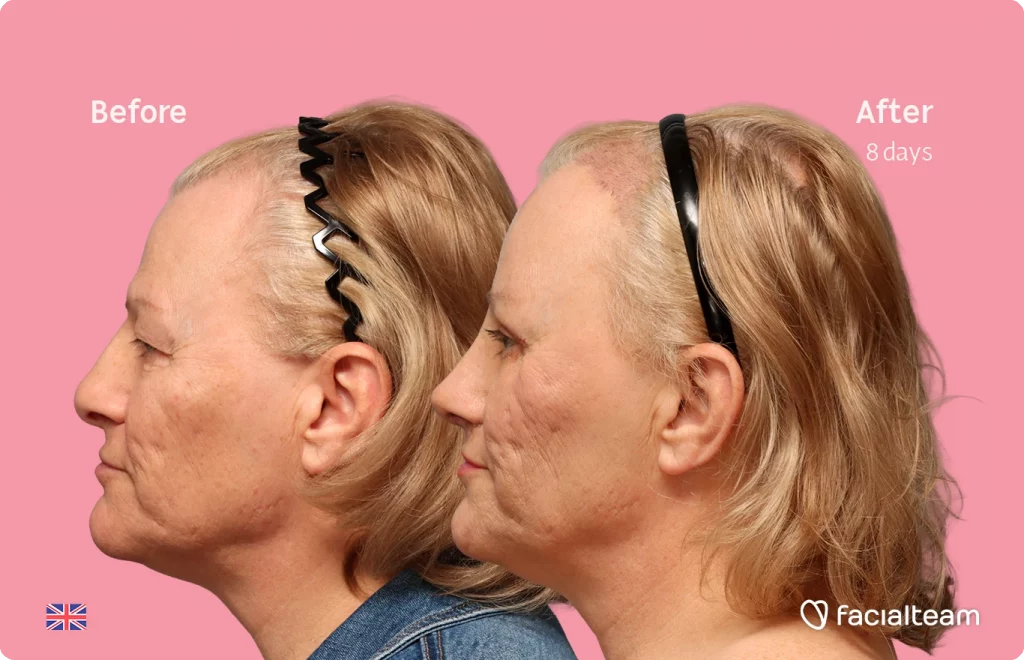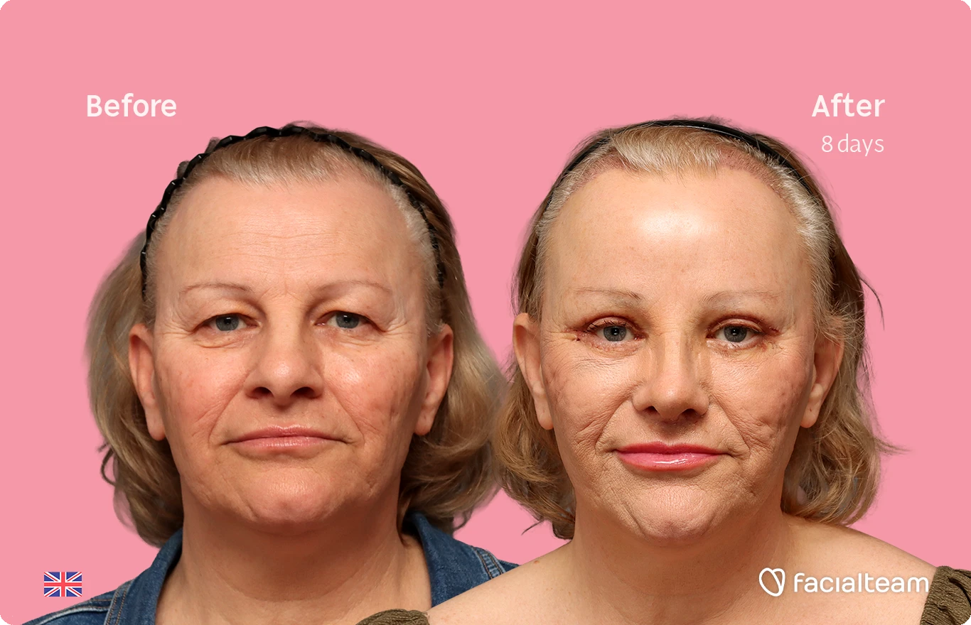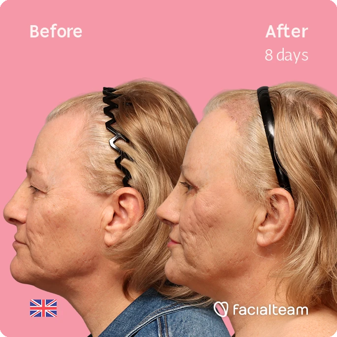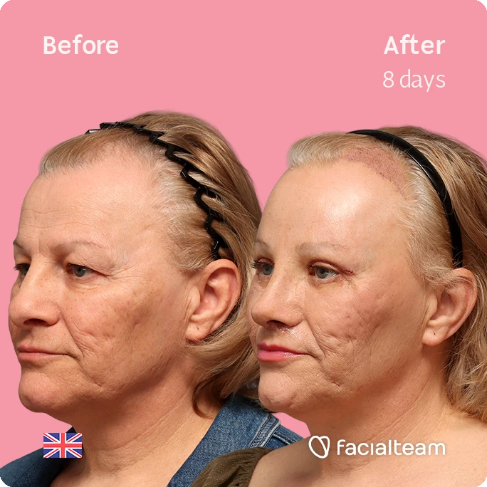 Rosalee, a 58-year-old woman from the United Kingdom, underwent facial feminization surgery at Facialteam in Marbella, including forehead feminization with simultaneous hair transplant (SHT) and rhinoplasty. As part of her comprehensive treatment plan, she also received secondary procedures: lip feminization and blepharoplasty (eyelid surgery). The before-and-after images, taken just eight days post-surgery, reveal the early stage of her transformation. While some swelling remains, her facial features already appear softer and more rejuvenated. Rosalee’s case highlights how a thoughtful combination of surgical and secondary procedures can create natural, age-affirming results that enhance both femininity and confidence.